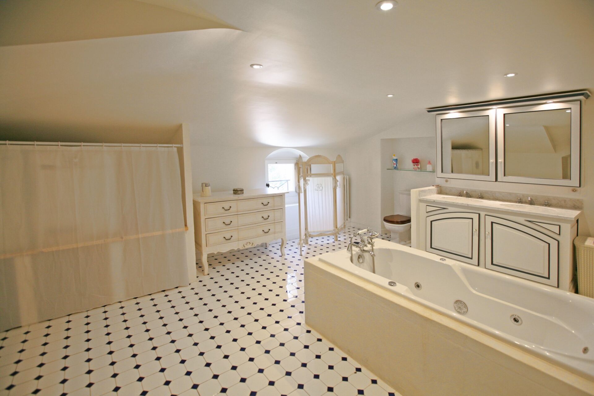 Au premier étage, on trouve la suite des maitres avec un salon qui ouvre d’un coté sur une chambre, puis une salle de bains, un dressing, un sauna et un WC, et de l’autre sur un grand bureau (possible chambre). Toujours au premier, une grande pièce bibliothèque, une autre chambre, une salle d’eau et un WC.