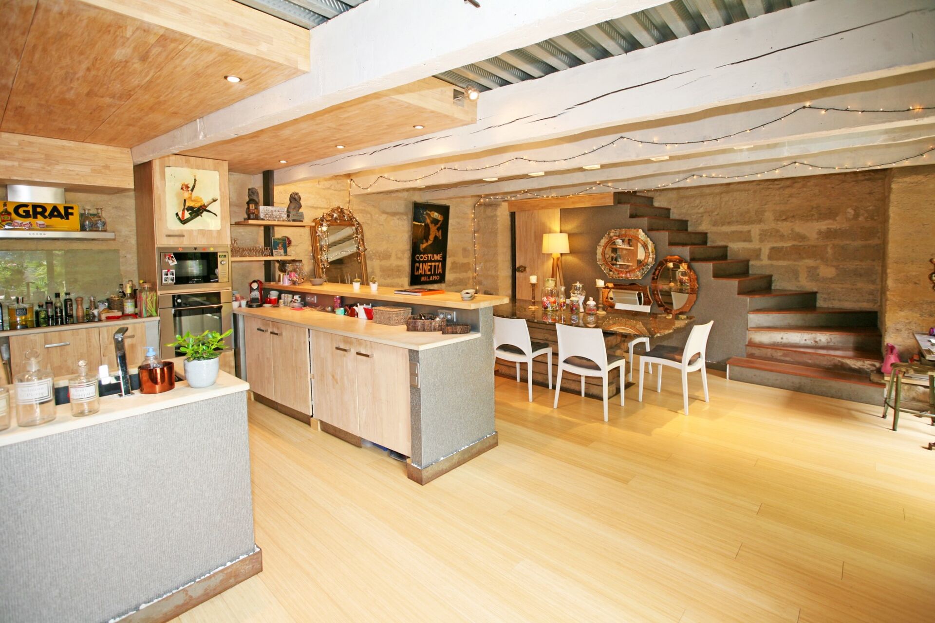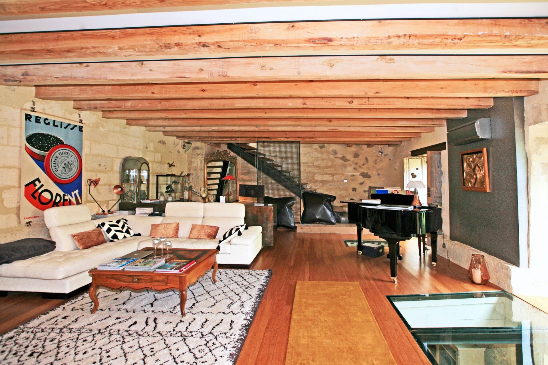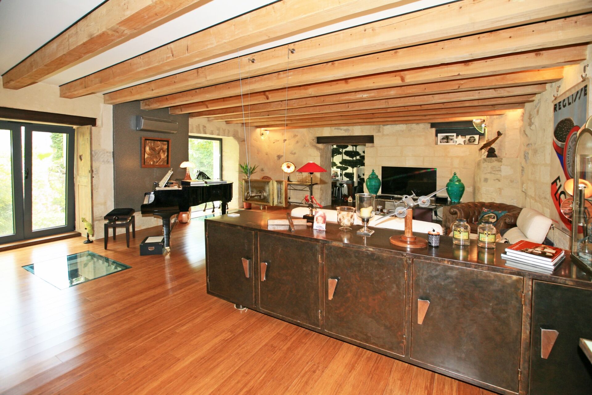 L’ensemble, plutôt atypique, est composé d’un mélange d’éléments anciens (pierre de taille) et d’éléments modernes (acier, verrières, etc.) qui devrait plaire aux amoureux des architectures mixtes.