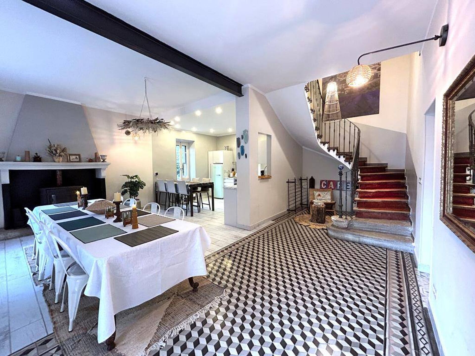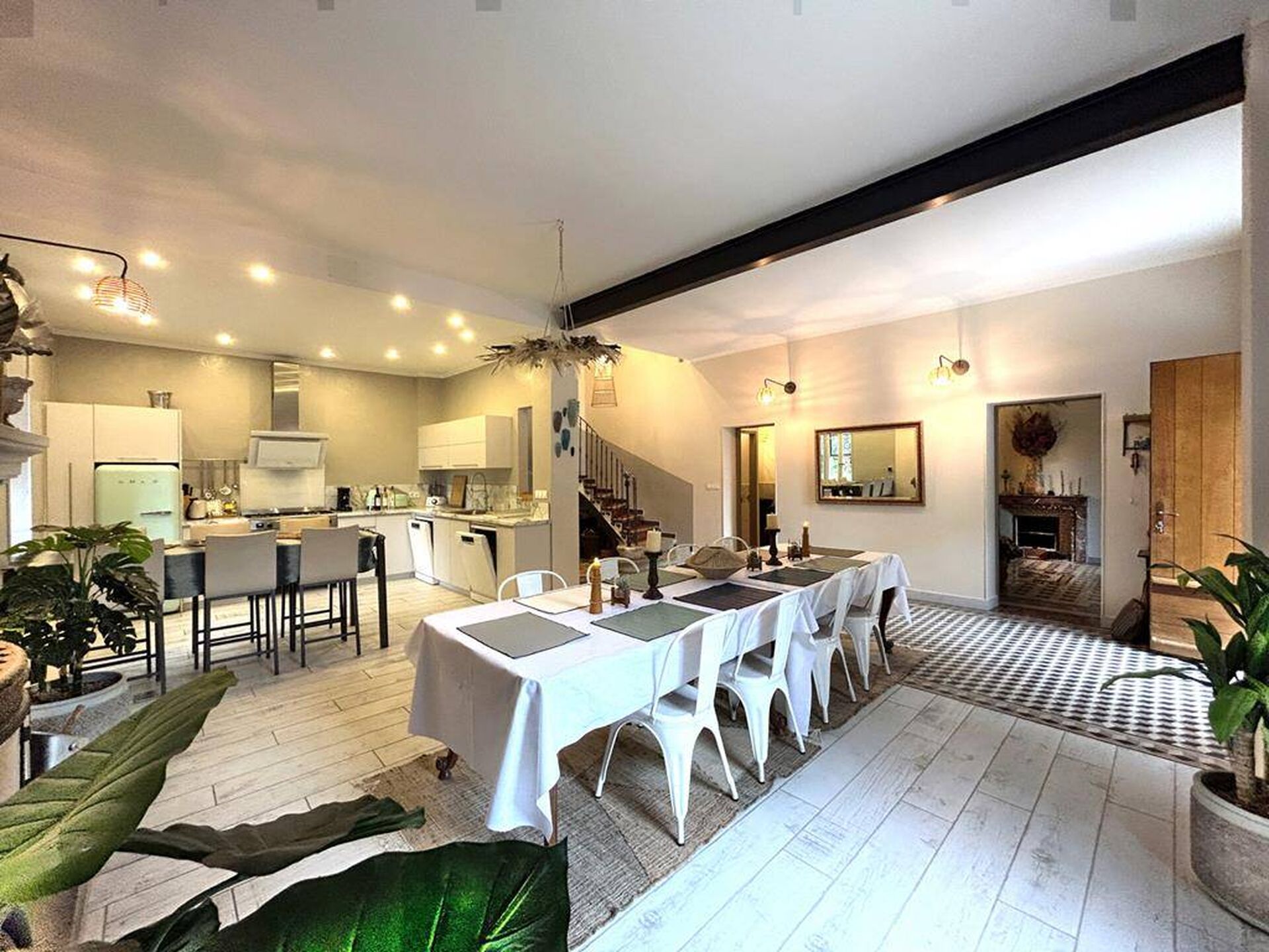 La maison déploie environ 195 m² de surface habitables, avec des hauteurs sous plafond allant de 2,80 m à 5 m. L'entrée se fait sur la pièce de vie d'environ 52 m² baignée de lumière, mixant le hall d'entrée, le salon avec un poêle à bois et la cuisine ouverte. Une buanderie, un WC indépendant.
