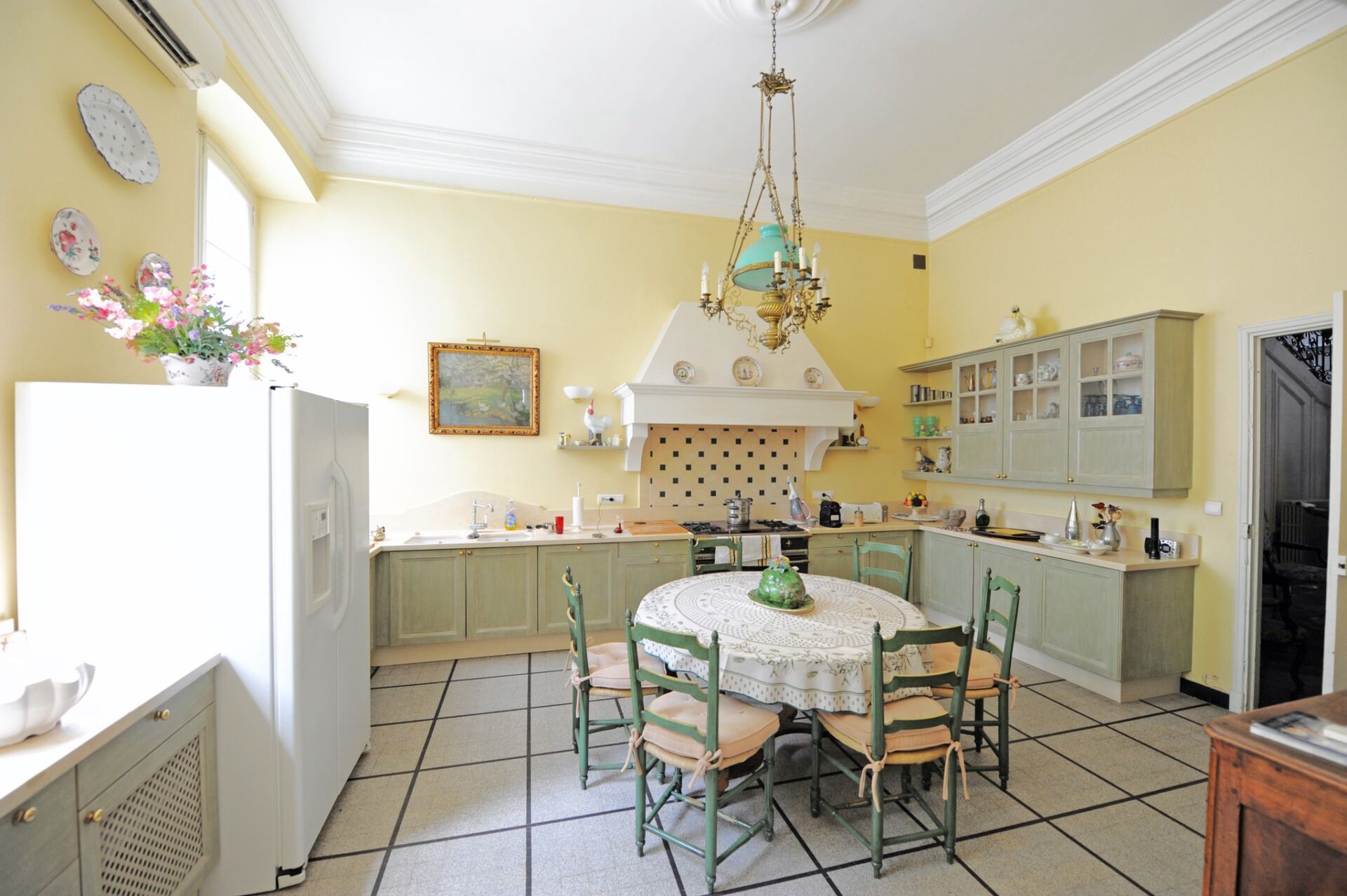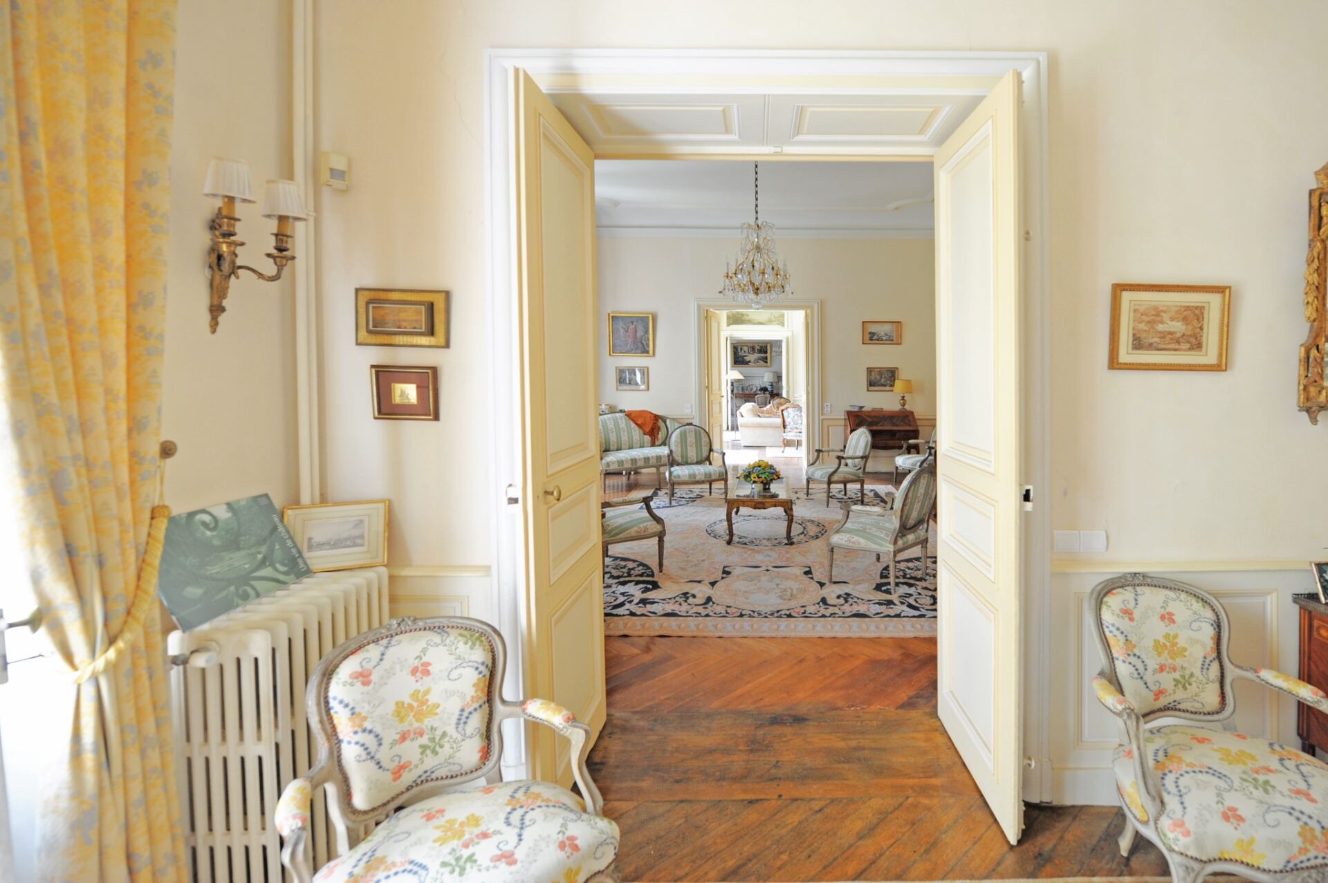 En rez-de-rue, une belle entrée vous amène à plusieurs pièces de réceptions donnant toutes sur le parc : un salon principal, puis en enfilade, côté Est, un 2ème salon cosy puis un 3ème salon de lecture, et côté Ouest, une salle à manger avec accès à la cuisine équipée à vivre (Atelier St Paul) avec un piano La Cornue et coin repas. La cage d'escaliers de service termine cette aile. Un wc et une buanderie se trouvent en fond du hall d'entrée.