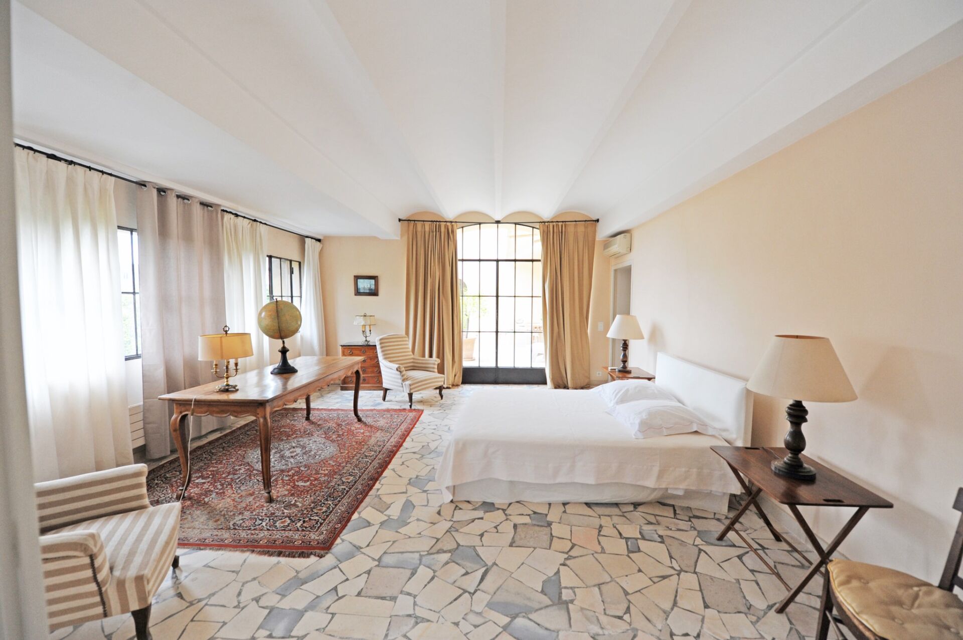 Par l'immense escalier en pierres, vous accédez au 1er étage où se trouvent à l'Ouest, les chambres I et II avec leurs salles de bains tout confort et wc privatifs, au Sud, un salon-tv (avec bibliothèque sur-mesure) puis en enfilade la chambre III avec salle de bains et wc. A l'Est, au-dessus de l'Orangeraie, un 1er appartement privé avec kitchenette équipée et une très grande chambre - bureau avec salle d'eau et wc accessible par l'escalier principal.