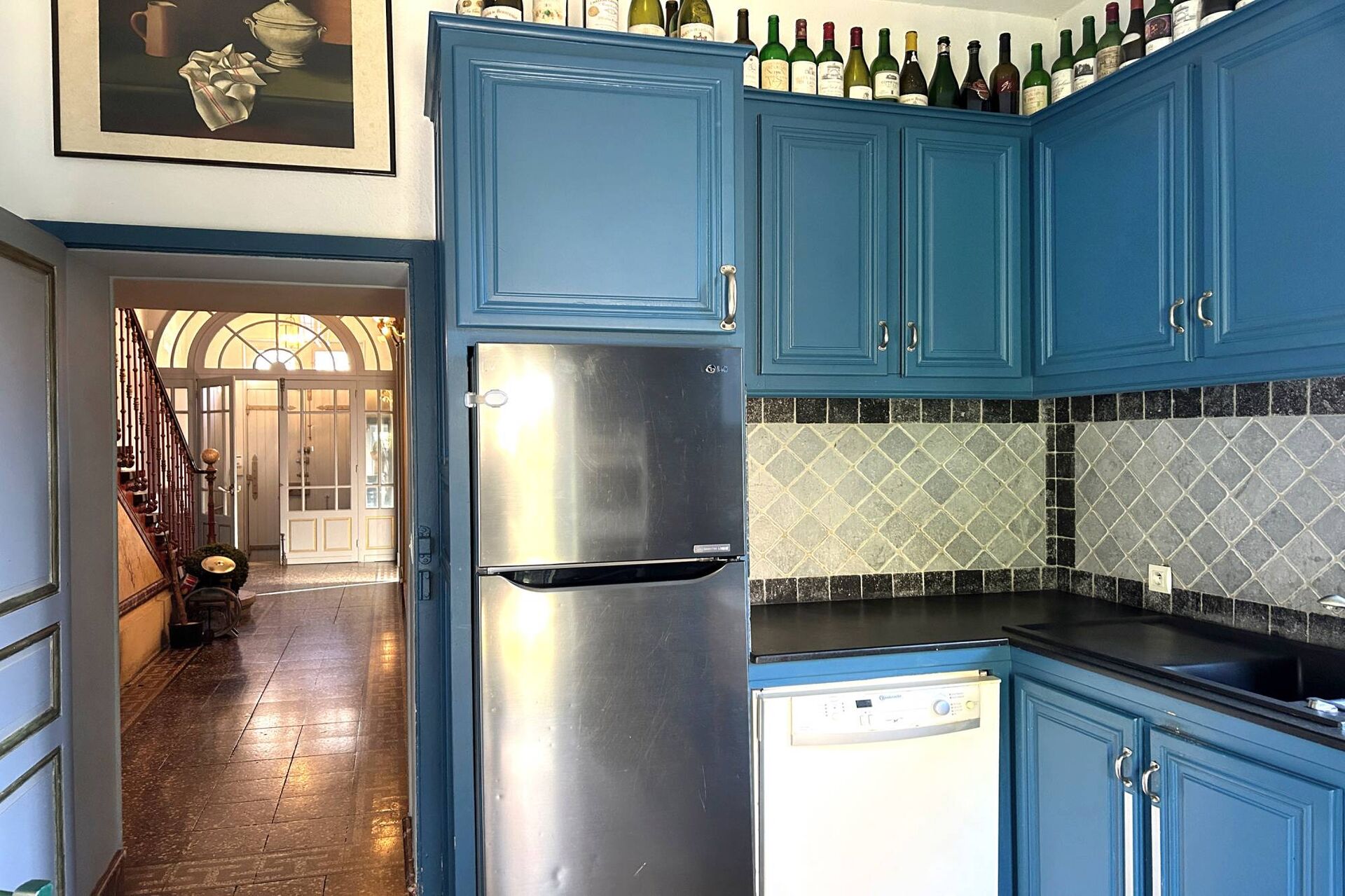 On poursuit dans des pièces d'une hauteur sous plafond de 3,65 m, on découvre un salon puis une salle à manger conviviale, baignés de lumière grâce aux grandes fenêtres orientées au sud. Une charmante cuisine, orientée vers le sud-ouest, donne sur la terrasse ombragée et la piscine.