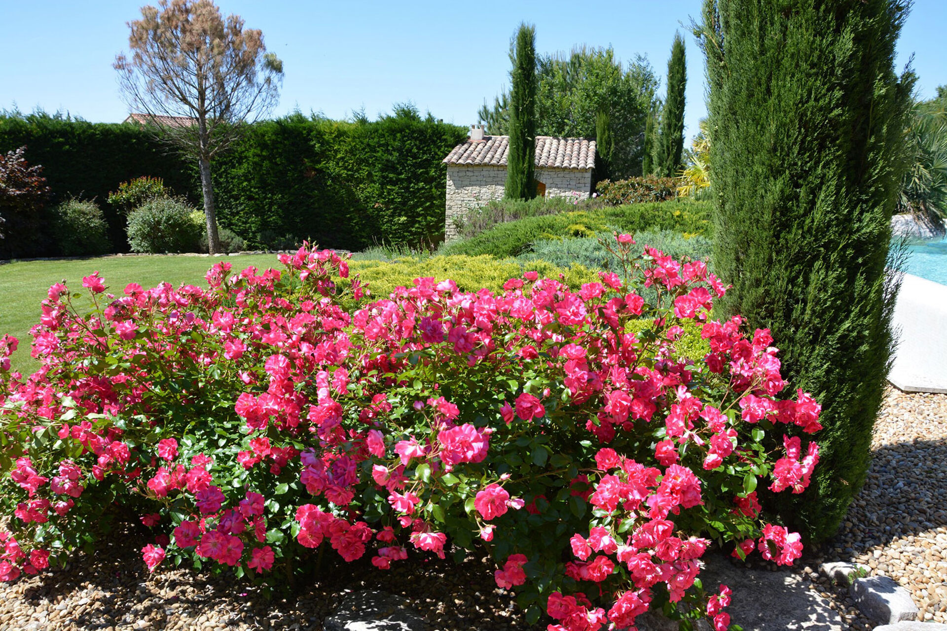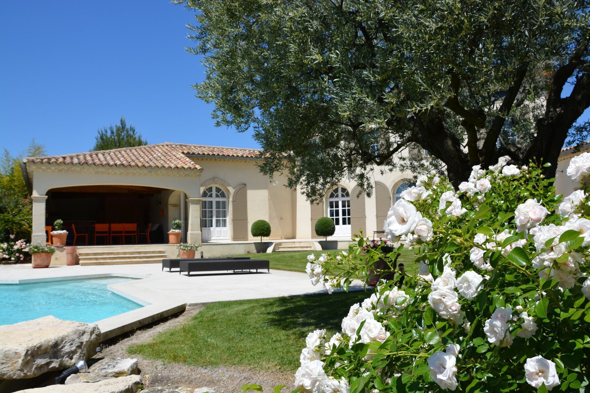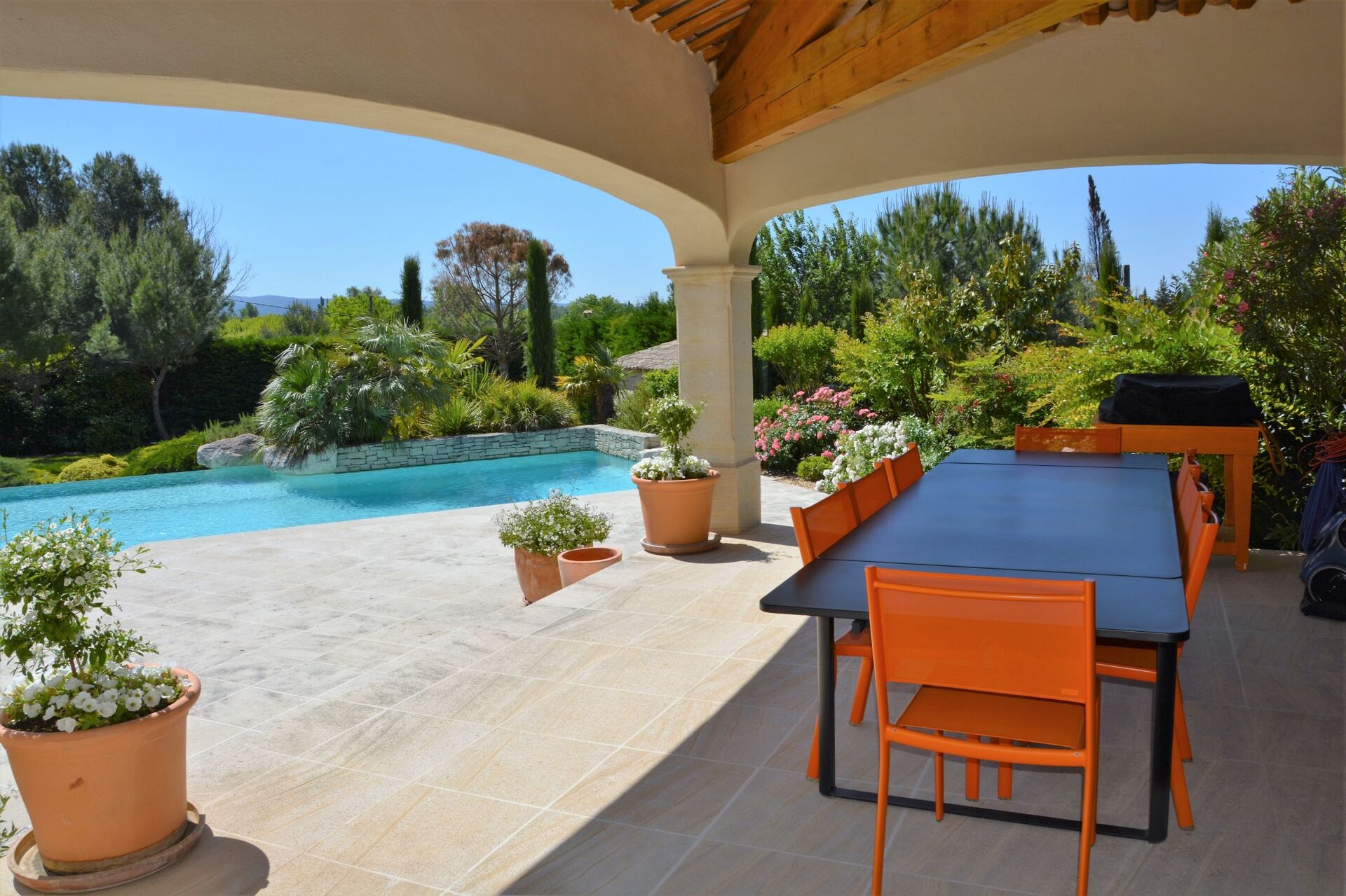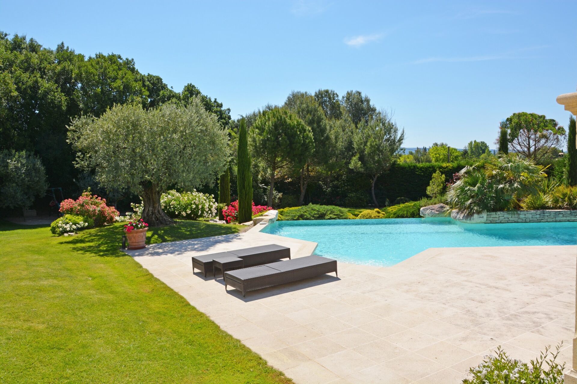 Sur le côté ouest de la maison, un pool house avec kitchenette, barbecue et douche, face à la piscine chauffée de forme libre à débordement (12 x 5 mètres) et son local technique en pierre. Le terrain est entièrement clos de murs, avec portail électrique, et superbement paysager autour des parterres de gazon, oliviers centenaires, pins et massifs fleuris. Derrière la maison se trouve un petit atelier de jardin indépendant.