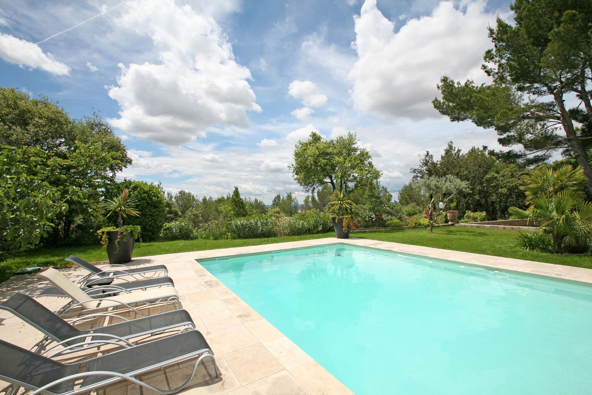 A quelques mètres en contrebas, une piscine de 14 x 6 mètres, de belles plages dallées en pierres, et un grand pool house équipé (auvent / pièce à vivre avec kitchenette et barbecue, cabinet de toilette avec douche et local technique).