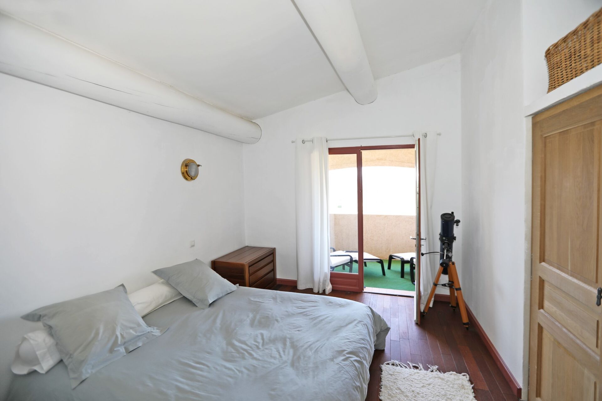A l’étage de la partie principale, on trouve une salle d’eau (douche équipée d’un pommeau de pluie, sèche serviette, etc.) et deux chambres, dont une donnant sur une terrasse couverte privée (loggia).