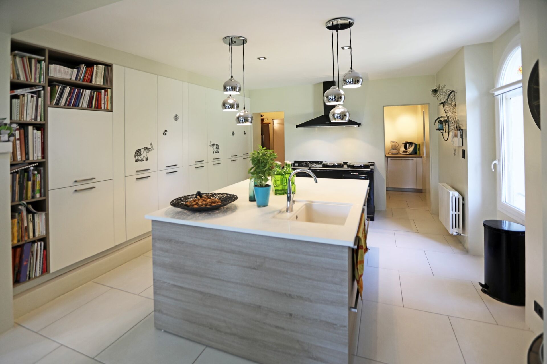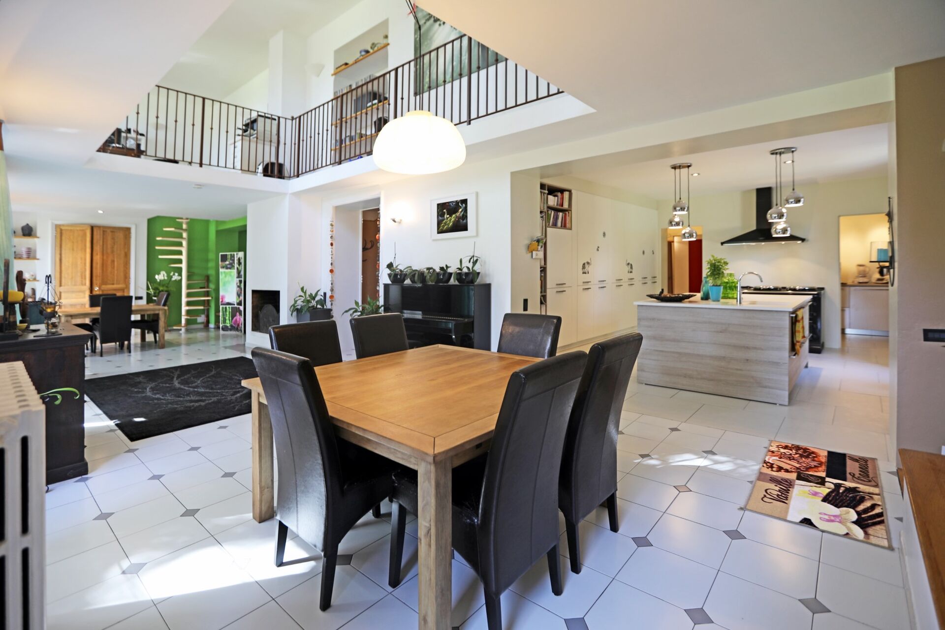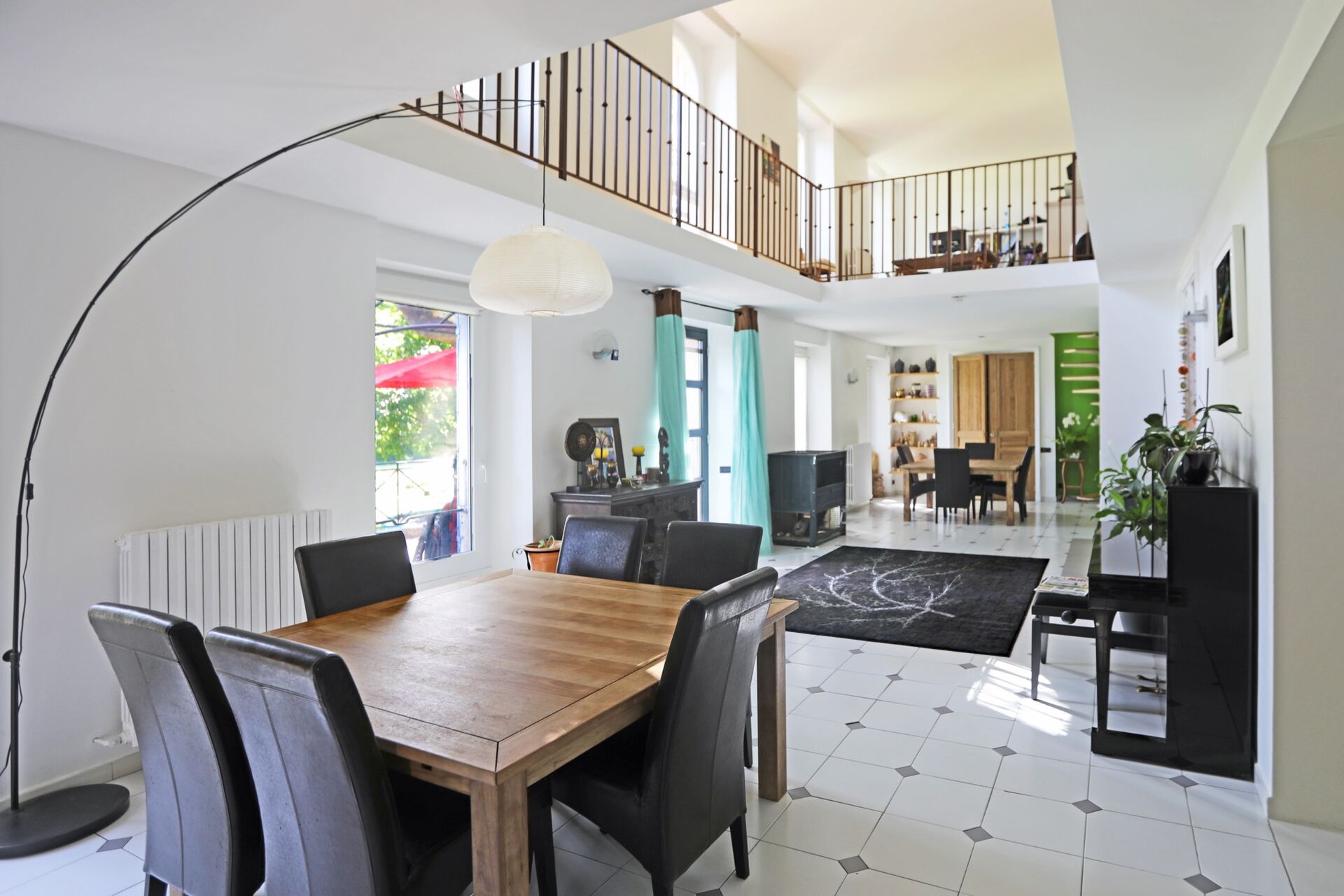 Au 1er étage, on trouve une grande pièce à vivre en L de belle hauteur (deux espaces de salons et un de repas, cheminée…) ouverte sur une cuisine équipée de qualité (îlot central, nombreux rangements, piano 4 fours et hotte aspirante AGA), puis une arrière-cuisine et une pièce de stockage. Les chambres I et II se partagent une salle de bain et un wc indépendant, la chambre III a sa salle d’eau intégrée.