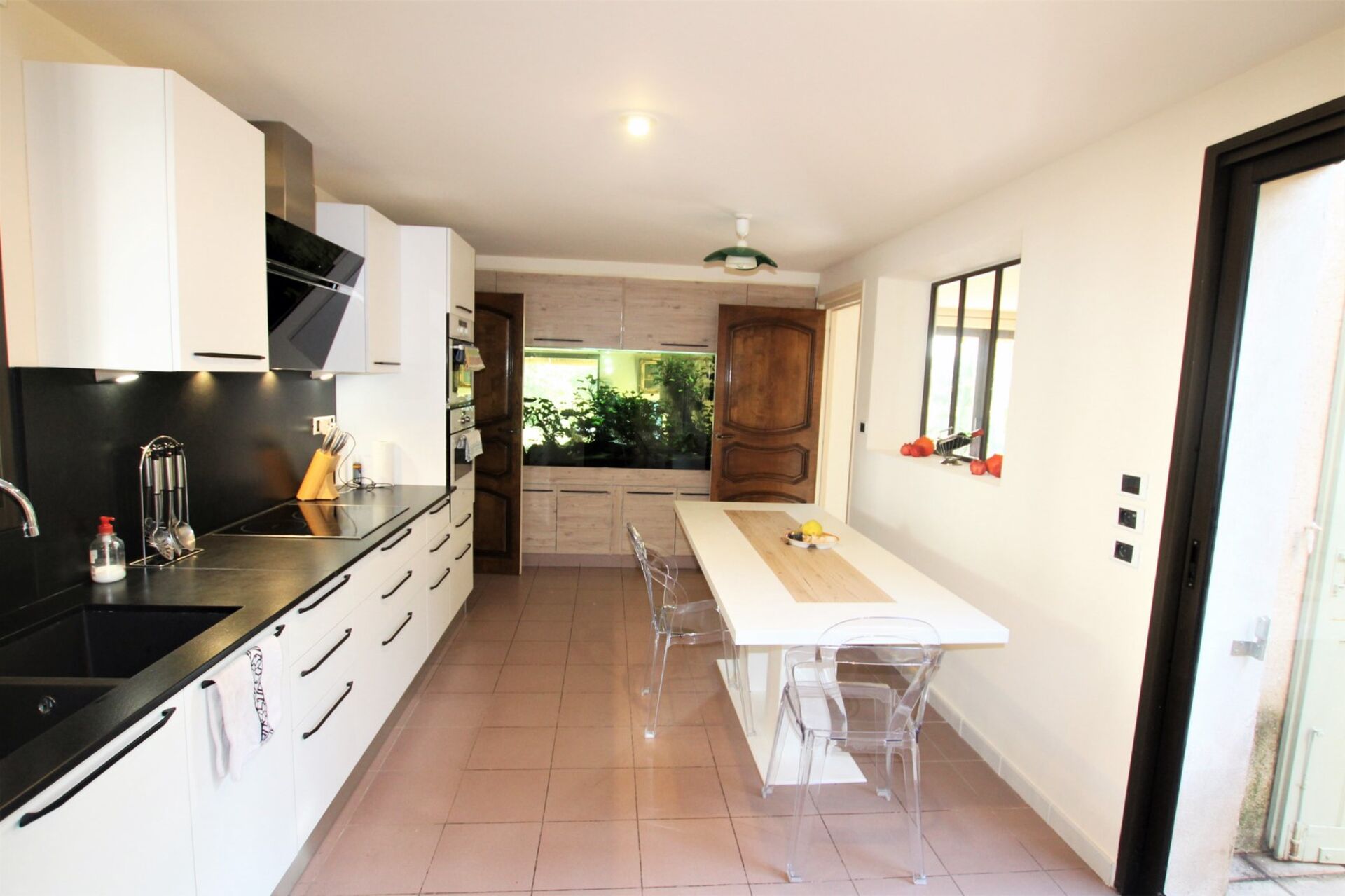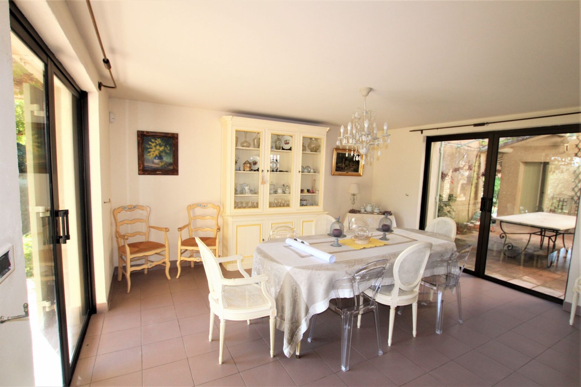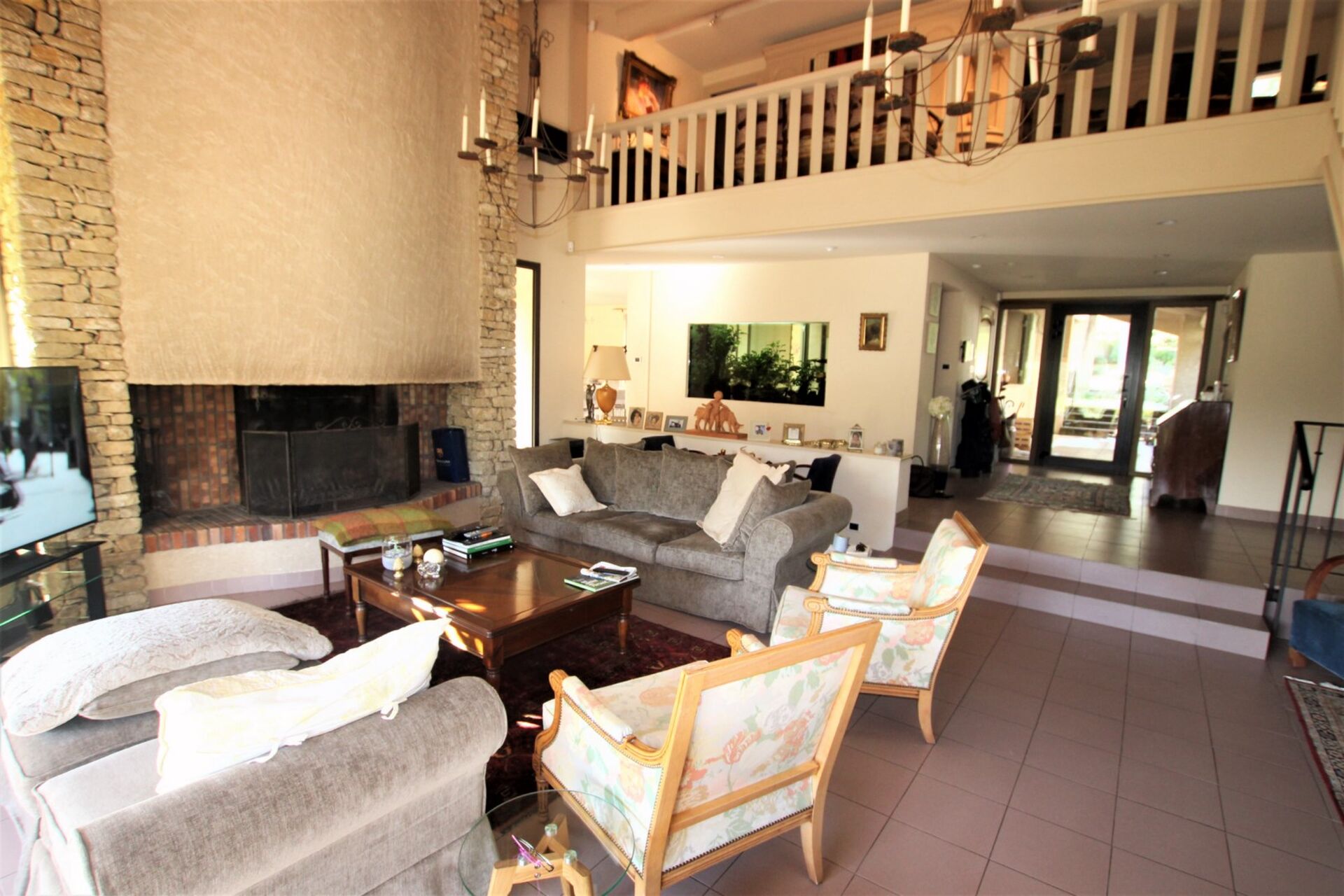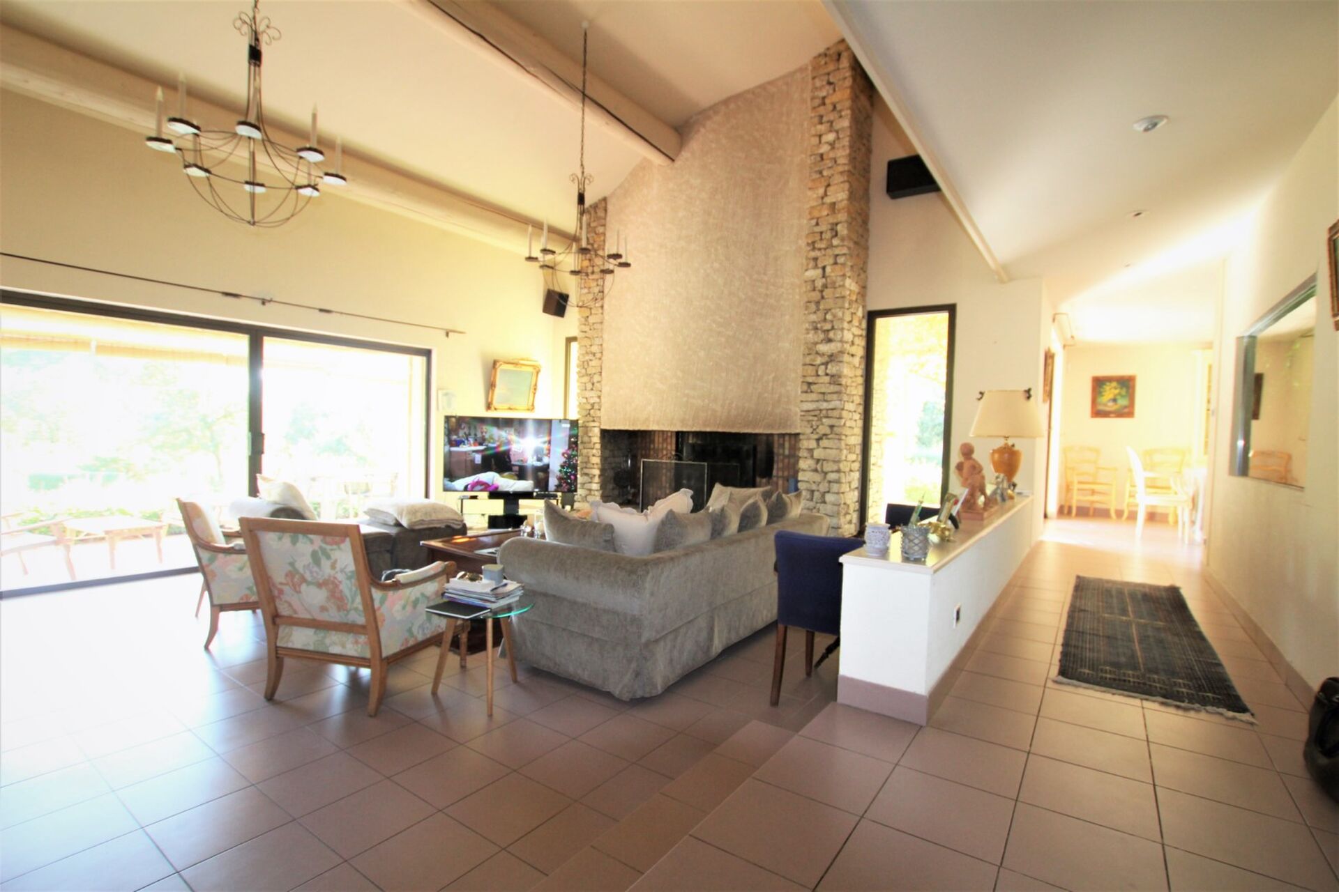 Cette villa provençale offre dès son entrée un grand salon avec cheminée qui communique avec une cuisine équipée et la salle à manger. Ces 3 pièces de vie sont très lumineuses et accèdent à différentes terrasses et patios.